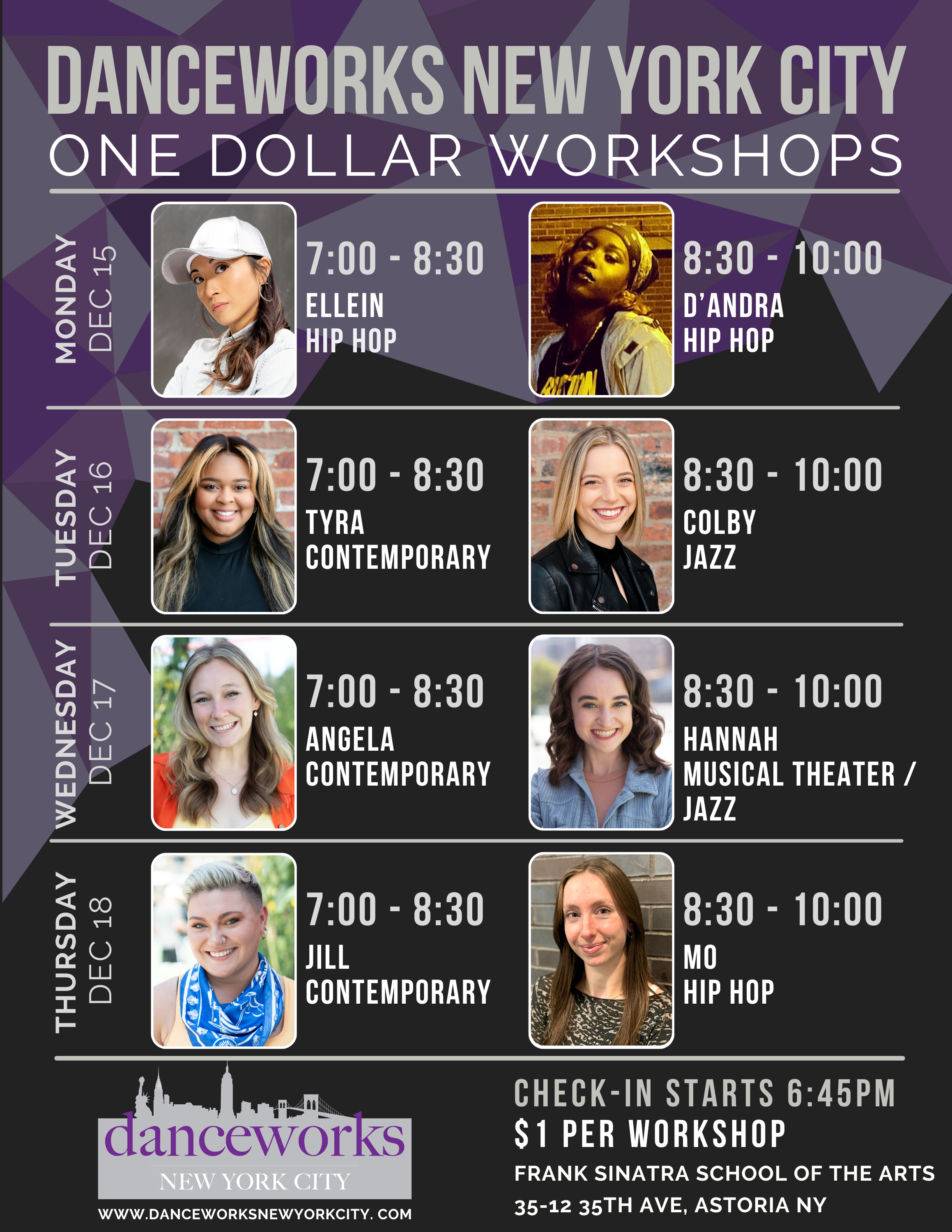 Visit the DanceWorks New York City Youtube Channel to see samples of previous One Dollar Workshops.